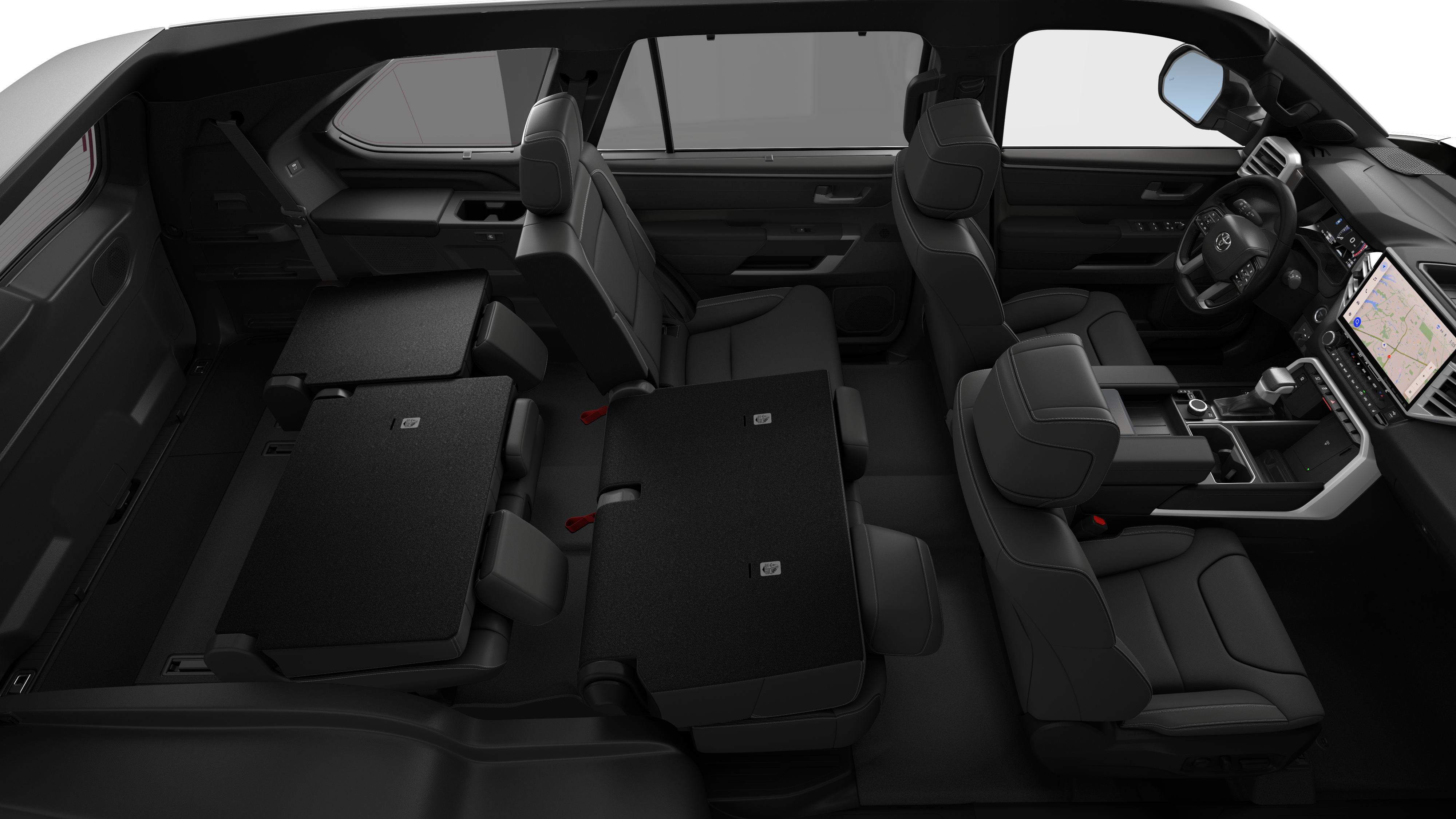 - 60/40 split, reclining, fold-down, fold-up, tumble-forward second-row seats with center armrest; adjustable headrests with one-touch access to third row